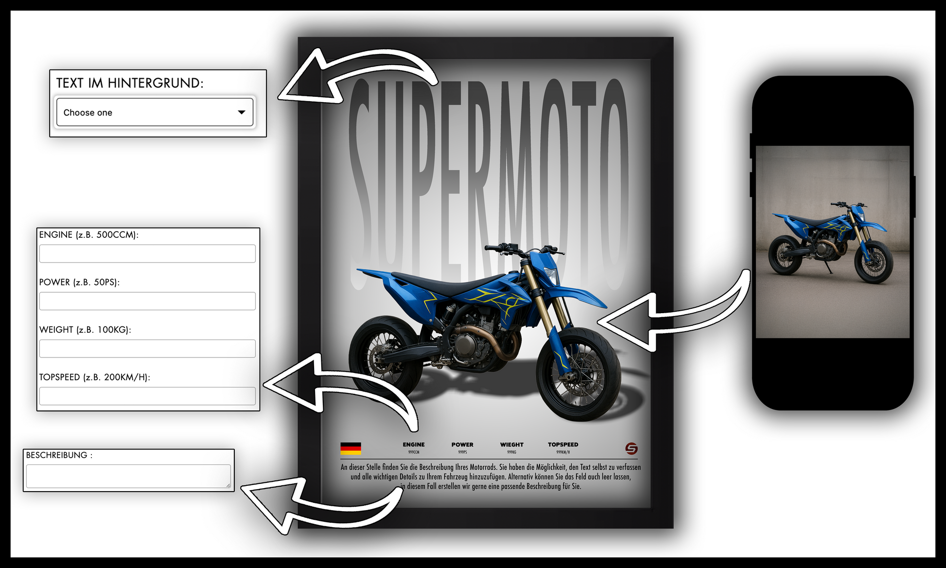 Verleihe deinem Zuhause oder deiner Garage das ultimative Motorrad-Feeling mit einem einzigartigen, personalisierten Poster! Jedes Poster wird speziell nach deinen Wünschen gestaltet und zeigt dein Motorrad in all seiner Schönheit und Power. Egal ob Sportbike, Chopper oder Cruiser – wir setzen dein Bike in Szene und kreieren ein Kunstwerk, das deine Leidenschaft für Motorräder perfekt widerspiegelt.